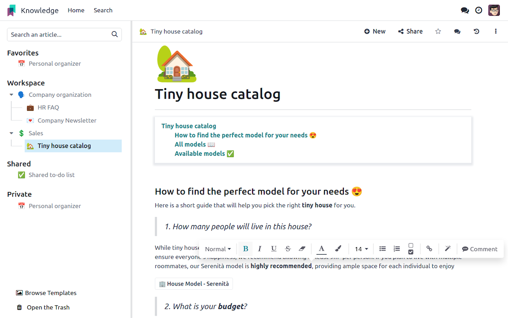 Odoo’s knowledge management software enables teams to collaborate and share information in a centralized hub.
